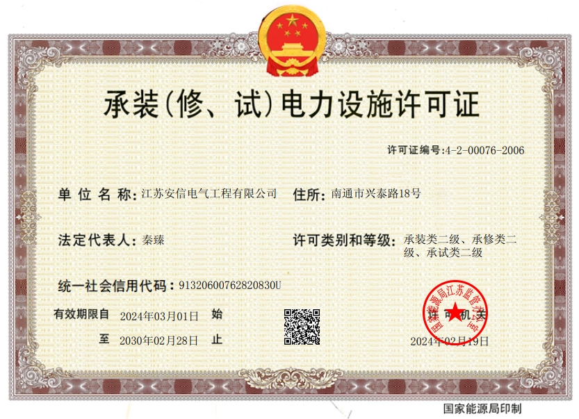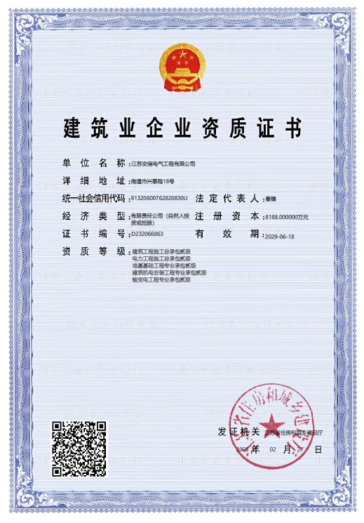 在創(chuàng)業(yè)之初,公司就堅持高起點的戰(zhàn)略思路,廣納賢才,集聚行業(yè)精英,創(chuàng)新發(fā)展,做優(yōu)企業(yè)品牌。現(xiàn)已取得:承裝二級、承修二級、承試二級,電力工程施工總承包二級,輸變電工程專業(yè)承包二級,建筑工程施工總承包二級,建筑機電安裝專業(yè)承包二級,地基基礎(chǔ)專業(yè)承包二級資質(zhì)證書,并通過了質(zhì)量、環(huán)境、職業(yè)健康和安全管理體系認(rèn)證,確保各項工作有序管控。